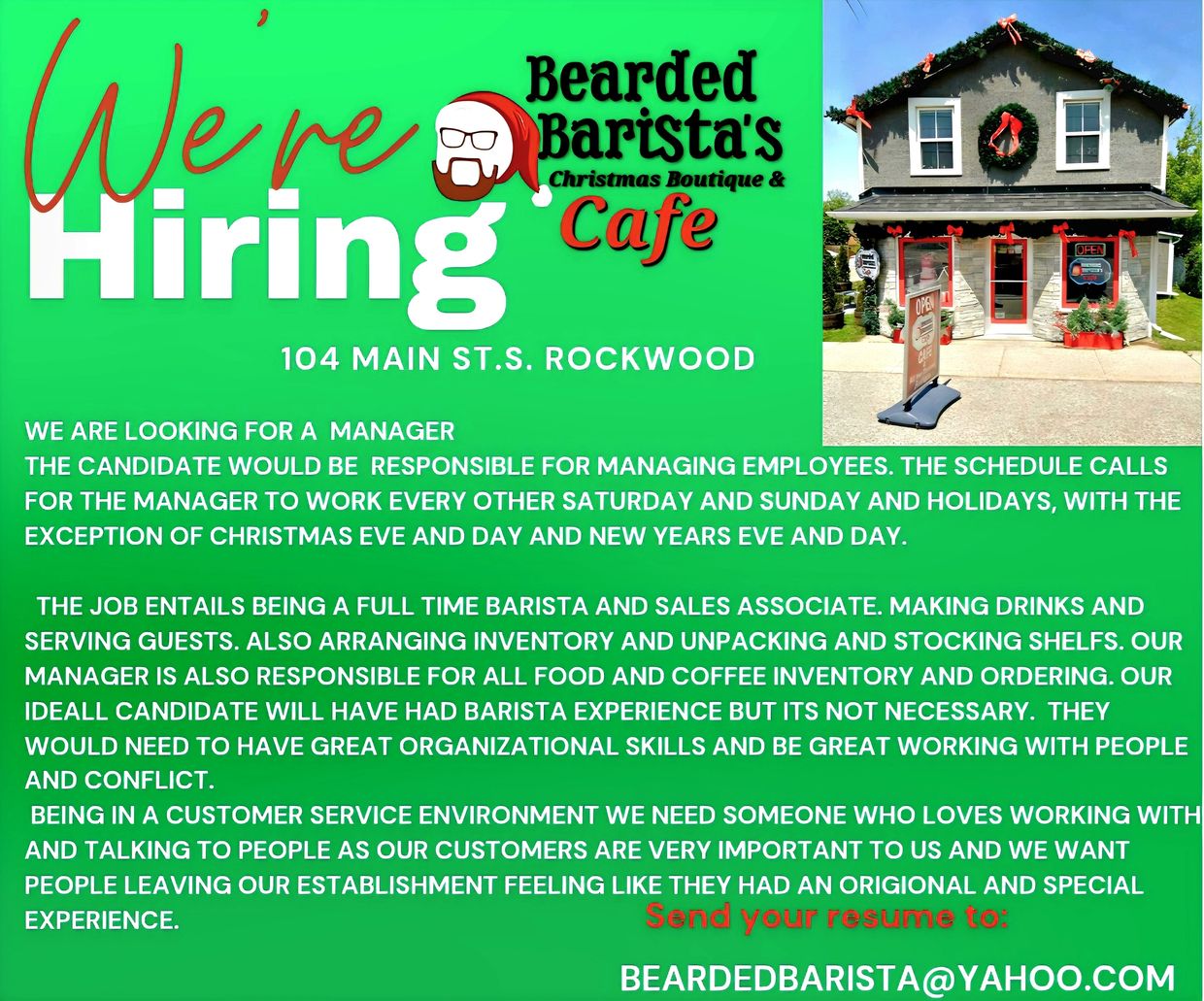 I have been in the service management industry for more than 20 years. I started my entrepreneurship adventure by running my mobile coffee bar catering business. I'm so excited to be welcomed into the Rockwood community, with my first brick and mortar Cafe. My family is crazy about Christmas, and so I thought, how wonderful would it be to have a year round Christmas cafe & Boutique.